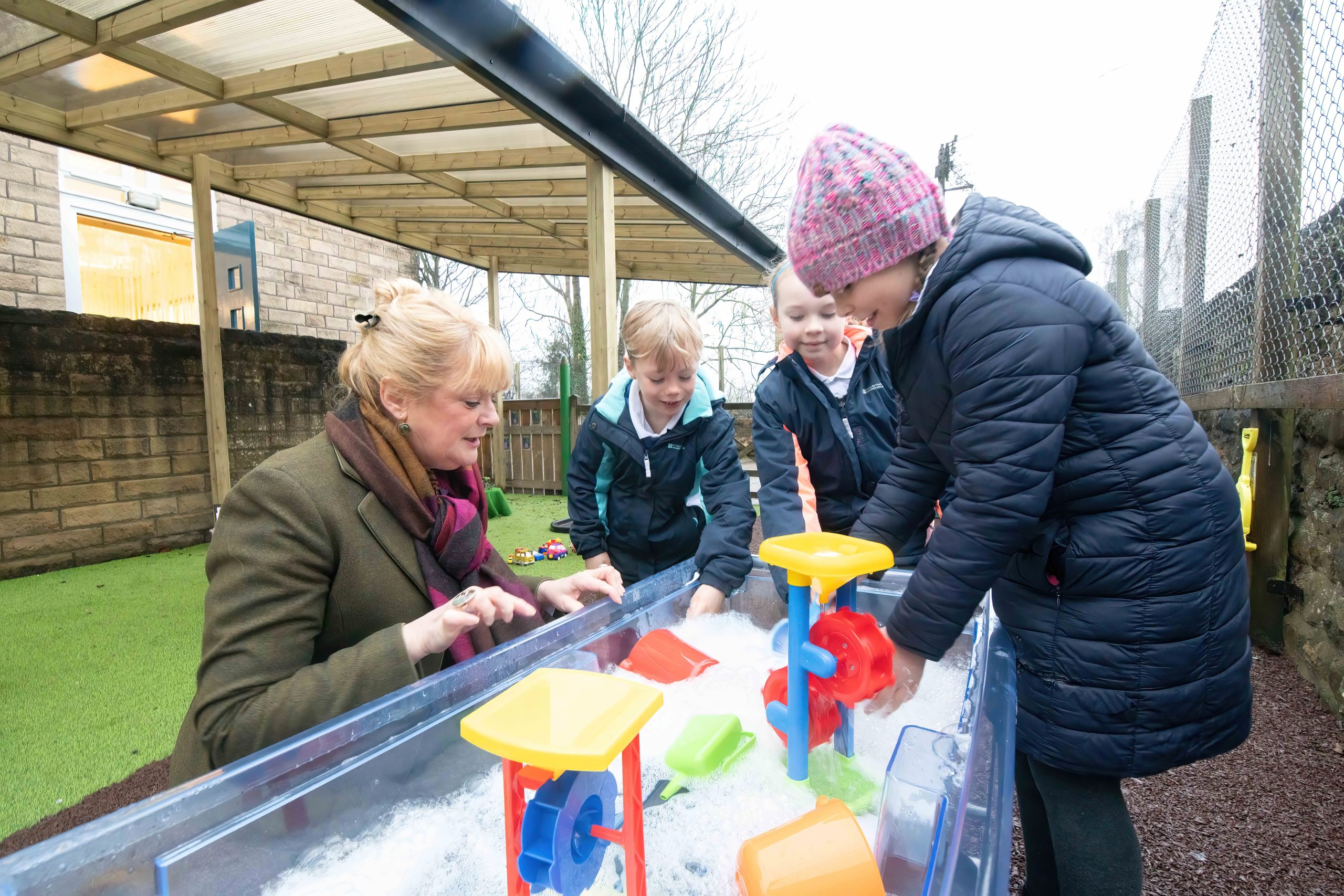 Children and an adult are playing with water and sand in a clear plastic table outdoors, under the cozy embrace of a Free Flow Shelter. They are bundled up in winter clothing, with coats and hats adding warmth to their outdoor adventure. At Masham Primary School, children are joyfully building with plastic blocks on the artificial grass outside, all under the watchful eye of a seated woman. A group of adults and children stand under a wooden shelter on artificial grass at Masham Primary School, with toys scattered on the ground. In the background, a brick building towers over bare trees.